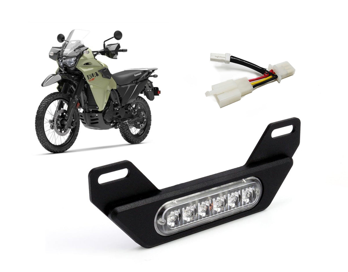 This pre-configured product bundle includes a single or dual B6 brake light, a plug-&-play B6 brake light wiring adapter for the KLR650, and a license plate mounting bracket kit that positions the B6 brake lights in the ideal location on the back of your KLR.