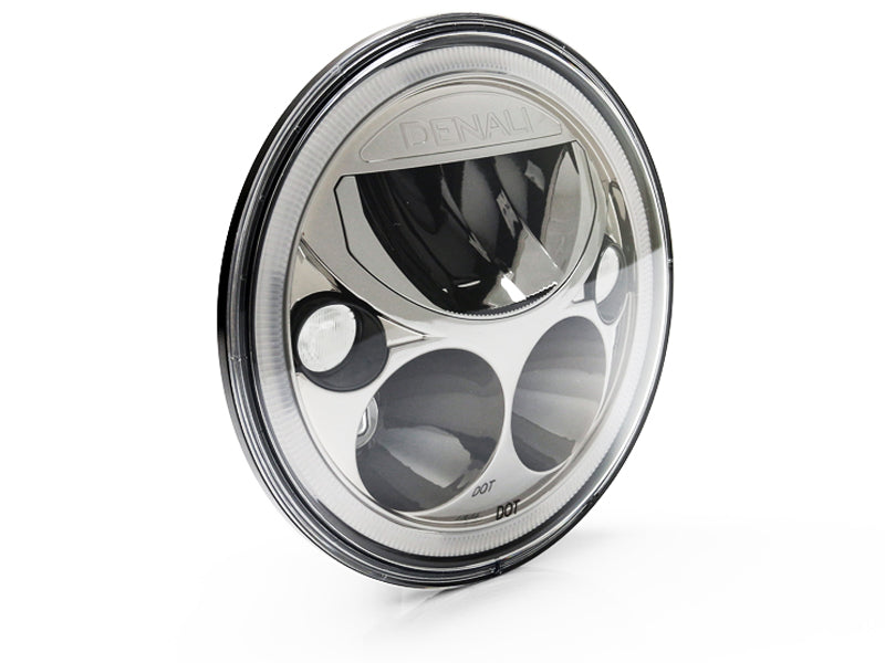 The DENALI DOT approved M7 LED Headlight module is a direct plug and play replacement to the original 7 inch sealed beam headlight on your motorcycle. It features a super wide low beam, piercing high beam, and halo day time running light. Drop this headlight module inside your existing headlight housing to throw a blazing beam of light three times further than your stock halogen headlight and twice as far as a stock LED headlight. The unique design and black chrome finish of the optics will give your bike that modern custom look while also increasing your visibility to oncoming traffic even during daylight.